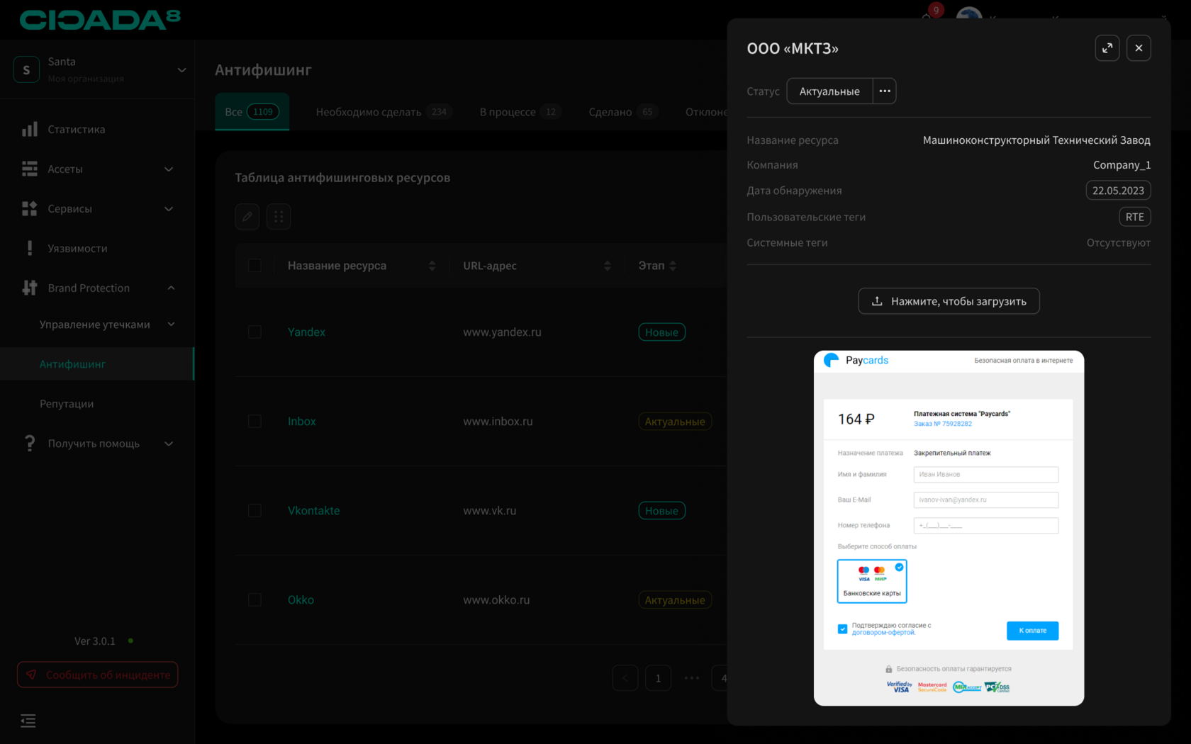 Отслеживайте последние утечки данных и негативные кейсы в СМИ. Будьте в курсе и блокируйте фишинговые ресурсы, нелегитимно использующие бренд компании
